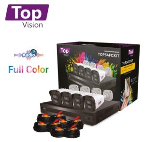KIT 4X4 TOPVISON INCLUYE 1 DVR XVR-504A 6CH 5 MP-LITE SOPORTA AUDIO SOBRE COAXIAL O UTP + 4 CÁMARAS HD TOPVISION BULLET 5 MP 3.6 MM TECNOLOGÍA FULL COLOR / MICRÓFONO INTEGRADO / CARCASA PLÁSTICA / IP67 / 12 VCD + 4 CABLES PRE PONCHADOS 18M C/U BNC Y ALIMENTACIÓN + FUENTE DE PODER